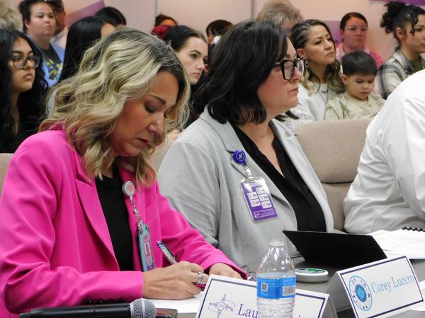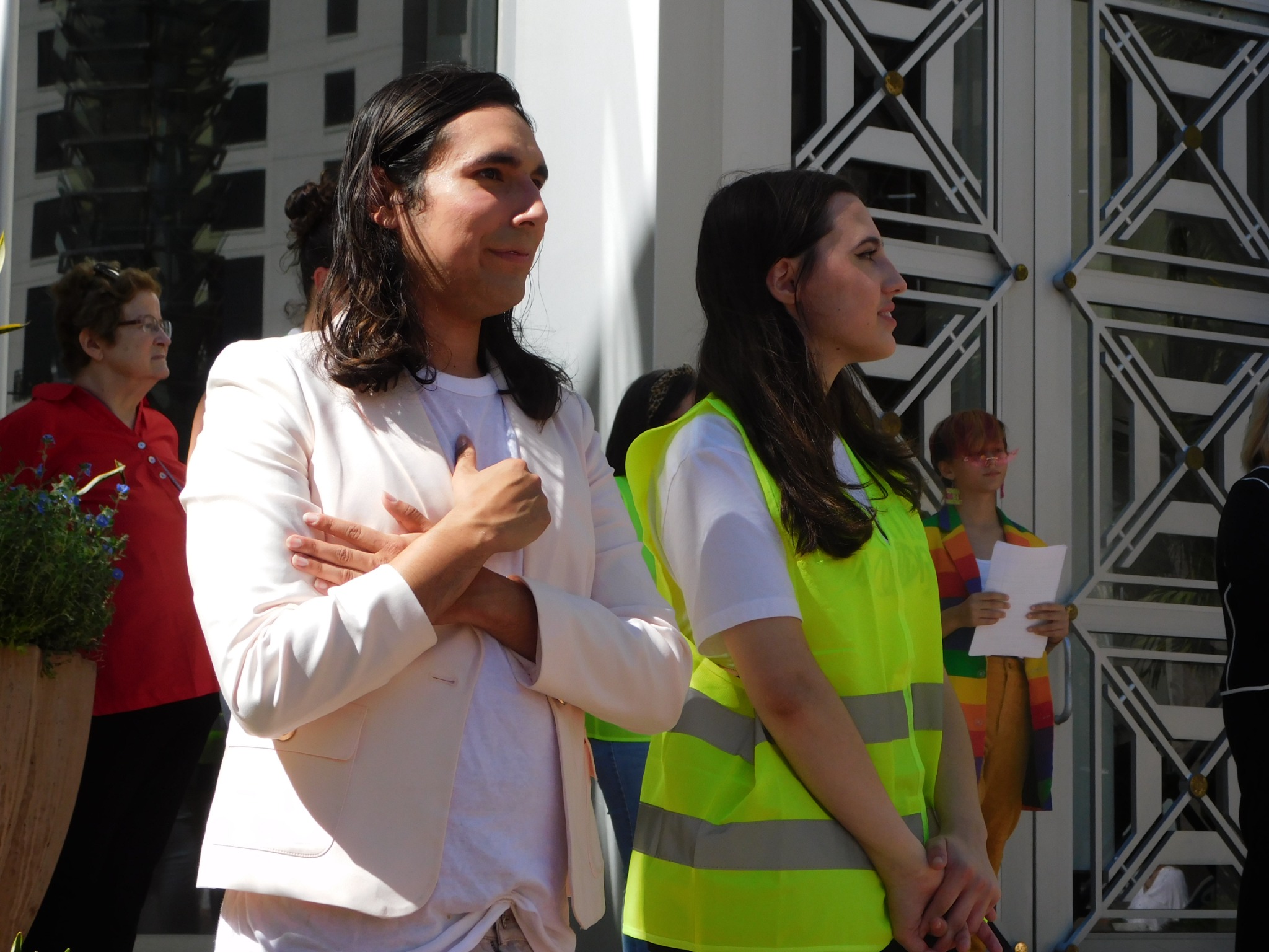 Jeremy Rodriguez (left), a member of Future Leaders of Orlando, listens to speakers at Orlando Women’s March on Sunday. Rodriguez said this year's march will focus on the overturn of Roe v. Wade and the 15-week abortion ban that has recently been passed on Florida. Several community driven organizations gathered at Orlando City Hall to march for reproductive rights.