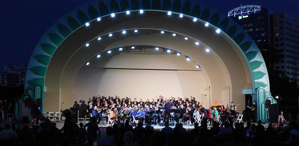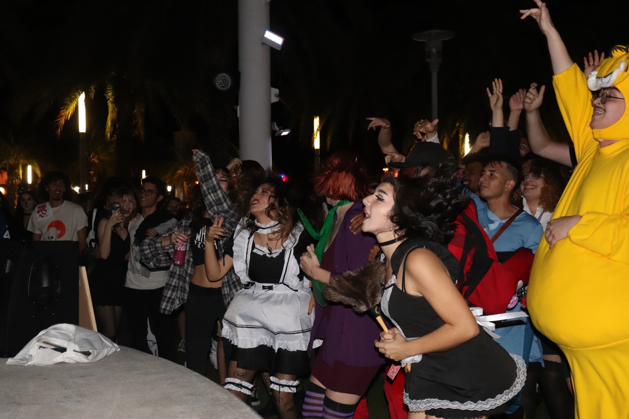 UCF students start dancing as Default Friends performs on stage at Addition Arena Side Stage on Tuesday. “Art is how we decorate space, music is how we decorate time,” said Oliver Sulla, who is the drummer for Accident Attorneys.